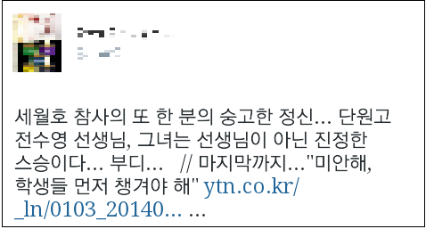 전 씨의 안타까운 소식이 알려지자 네티즌들은 “하늘나라에서도 제자들과 행복하게 지내시길 바랍니다. 미안합니다”(@VA*), “무서워했을 제자들을 끝까지 곁에서 지켜주셔서 감사합니다”(@ansk****), “진정한 단원고 교사"(@joy****)”라며 안타까움을 토로했다.