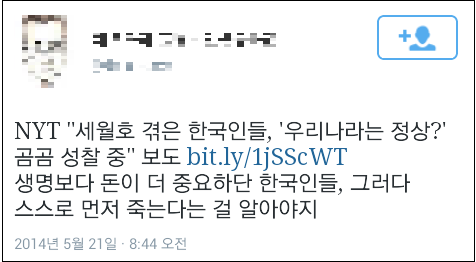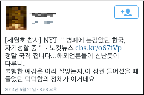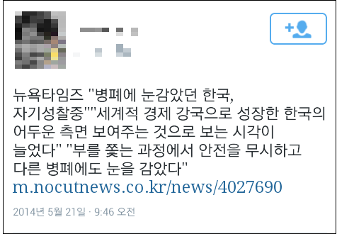 신문은 이어 세월호 참사와 서울 상왕십리역 지하철 추돌사고 등을 거론하며 “한국인들은 이런 사고를 별개의 사고가 아닌 규제 시스템의 붕괴로 보기 시작했다”며 “이는 세계 경제강국으로 성장한 한국의 어두운 측면으로 보는 한국인들의 시각이 늘고 있는 것”이라고 분석했다.