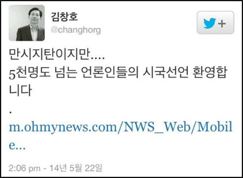 | 다음은 언론인 시국선언문 전문. 언론의 사명을 다시 가슴에 새기겠습니다 세월호 참사가 발생한지 한 달이 넘게 지났습니다. 지난 한 달 여 동안 대한민국은 함께 침몰했습니다. 그리고 정확성, 공정성, 독립성을 생명으로 하는 언론의 사명 또한 침몰하고 말았습니다. 사건 당일 ‘전원 구조’라는 언론 역사상 최악의 대형 오보를 저질러 실종자 가족들을 비롯한 전 국민을 충격과 분노에 빠뜨렸습니다. 취재를 통한 사실 확인보다는 정부의 발표를 받아쓰기에 급급한 나머지 오직 진실규명을 바라는 국민들의 한결같은 바람을 저버리고 말았습니다. 슬픔에 빠진 유가족들과 실종자 가족들에게 위로는커녕 망언을 내뱉는 공영방송 간부라는 사람들의 패륜적인 행태도 막아내지 못했습니다. 그리고 ‘청와대의 지시’를 받아 공영방송 KBS의 보도를 좌지우지해왔다는 의혹을 받고 있는 길환영 사장도 아직 쫓아내지 못하고 있습니다. 청와대의 보도통제 의혹에 대해 침묵하고 있는 박 대통령으로부터 진상규명에 대한 어떤 약속도 받아내지 못했습니다. 대한민국 언론은 죽었습니다. 세월호 참사는 이미 한참 전에 죽어버린 언론의 모습을 드러내는 하나의 계기였을 뿐입니다. 대한민국의 주인은 국민이고, 언론의 존재이유는 대한민국의 주인인 국민에게 정확하고 공정하게 사실을 알려주기 위함이라는 지극히 당연한 상식이 무너지기 시작하면서 언론은 죽은 것이나 다름없게 되었습니다. ‘죽은 언론’의 주인은 국민이 아니라 대통령이고 ‘죽은 언론’은 오직 권력자를 향한 해바라기 그 이상도 이하도 아닙니다. 국민 여러분께 정말 죄송합니다. 막말하는 간부도, 대통령만 바라보고 가는 사장도 막아내지 못했습니다. 권력이 언론을 손에 쥐고 휘두르려 하는데도 목숨 걸고 저항하지 못했습니다. 국민의 눈과 귀와 입이 되지는 못할망정 국민의 눈과 귀와 입을 가리는 데 일조하고 말았습니다. 방송을 장악하지 않겠다는 대통령의 말도 지지부진하기만 했던 국회의 방송공정성 논의도 이행하도록 만들지 못했습니다. 그러나, 다시 살려내겠습니다. 언론의 사명을 훼손하려는 모든 시도에 맞서 단호히 저항하겠습니다. 청와대의 방송장악 보도통제 의혹에 대한 철저한 진상규명과 책임자 처벌, 재발 방지를 위한 제도개선책이 마련될 때까지 우리는 가만히 있지 않고 행동할 것입니다. 언론이 존재해야 하는 유일한 이유, 오직 국민의 알 권리를 위해 정진하겠습니다. 그것이 세월호와 함께 속절없이 스러져간 희생자들에 대한 최소한의 도리이자 우리에게 부여된 영원한 사명입니다. 세월호 참사 희생자들의 명복을 빕니다. 영원히 잊지 않겠습니다. 2014년 5월 22일 현업 언론인 시국선언 참가자 일동 ※ 시국선언 참여자 현황 |