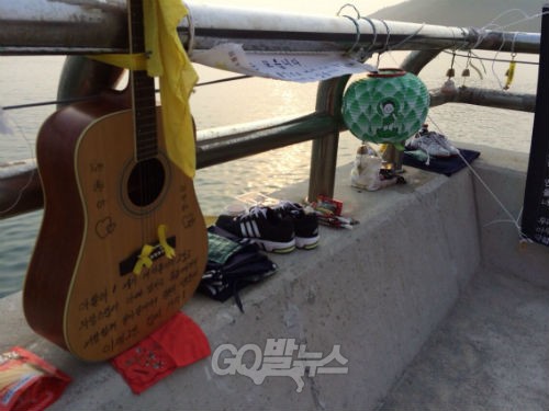 세월호 참사 실종자 가족들이 운동화와 기타 등 아직 돌아오지 않은 아이들의 물건을 진도 팽목항에 가져다 놓았다.