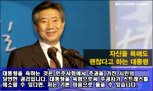 노무현 대통령은 ‘대통령을 욕하는 것은 민주사회에서 주권을 가진 시민의 당연한 권리’라고 말하며, ‘대통령을 욕함으로써 주권자가 스트레스를 해소할 수 있다면, 저는 기쁜 마음으로 들을 수 있습니다.’는 역대 대통령과는 전혀 다른 주장을 펼쳤습니다.