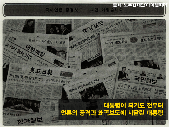 노무현 대통령은 대통령이 되기도 전부터 언론의 공격과 왜곡 보도에 시달렸습니다. 대통령에 취임했어도 언론은 끊임없이 그를 공격했고, 급기야는 해외 언론의 기사를 반대로 해석하여 그를 ‘나쁜 대통령’으로 만들었습니다.