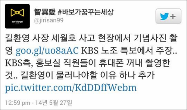 KBS노동조합은 27일 특보를 통해 지난달 19일 길환영 사장이 수행단을 이끌고 사고 현장에서 200m 떨어진 생방송 페리를 방문해 ‘이왕 온 김에 모두 사진 한 번 찍자’라면서 2차례에 걸쳐 사진을 찍었다고 폭로했다.
