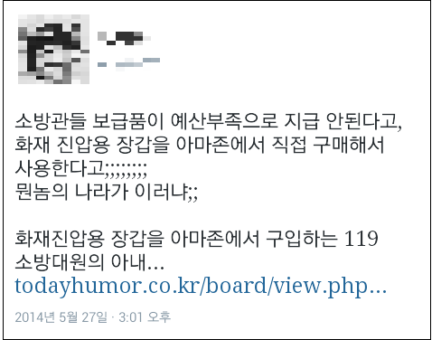 현직 소방공무원들이 화재 진압 시 사용하는 물품을 사비로 산다는 글이 인터넷 상에서 화제가 되고 있다. 27일 한 온라인 커뮤니티에 자신을 현직 소방공무원이라 소개한 네티즌들이 적은 글이다.