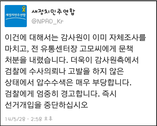 새정치민주연합 한정애 대변인도 브리핑을 통해 “감사원, 농림수산식품부, 그리고 검찰까지, 서울시장 선거에 노골적으로 개입한 총체적인 관권선거로밖에 볼 수 없다”며 박원순 시장 죽이기를 중단하라고 촉구했다.