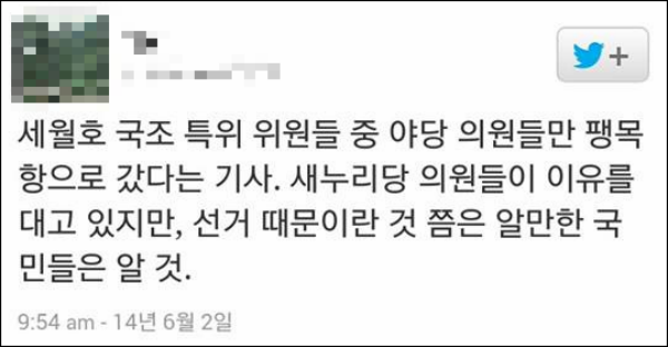 이에 새정치민주연합 박영선 의원은 트위터를 통해 “약속을 깨고 새누리당이 팽목항을 가지 않은 것은 팽목항을 두려워하거나 진심결여로 분석됩니다. 팽목항은 시간 날 때 가는 곳이 아니니까요”라고 말했고, 유기홍 의원도 “선거만 생각하는 비정하고 몰염치한 행태”라고 강하게 비판했다.