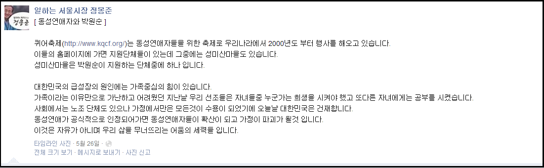 정몽준 새누리당 서울시장 후보 지지자들이 운영하는 것으로 보이는 페이스북 계정 '일하는 서울시장 정몽준(https://www.facebook.com/workmj)가 성소수자를 혐오하는 글을 잇따라 게시하며 박원순 서울시장을 비방하고 나서 논란이 되고 있다.
