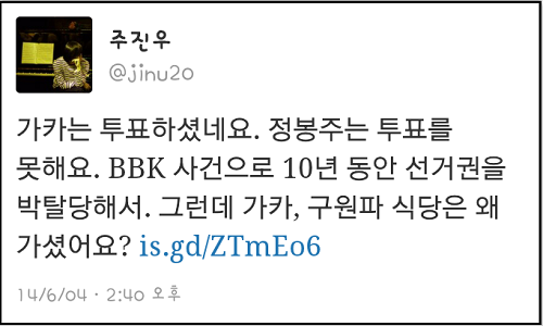 한편, 기사를 작성한 주진우 기자는 4일 자신의 트위터를 통해 “가카는 투표하셨네요. 정봉주는 투표를 못해요. BBK사건으로 10년 동안 선거권을 박탈당해서. 그런데 가카, 구원파 식당은 왜 가셨어요?”라면서 해당 기사를 링크했다.