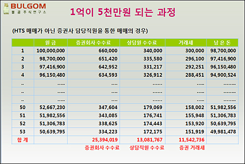 1.3%의 수수료는 어느 정도 일까? 1억 원을 가지고 수익과 손실이 없는 동일가격에 매달 4번 정도의 거래를 한다면 13개월 후 53번째 거래에서 남는 원금은 5000만원 이하로 반토막이 된다. 이런 투자방식으로 주식투자를 한다면 50%정도의 매매수익을 유지해야 원금을 지킬 수 있다는 얘기다.