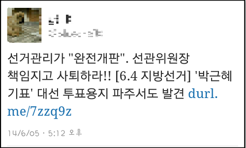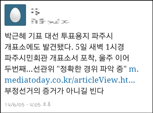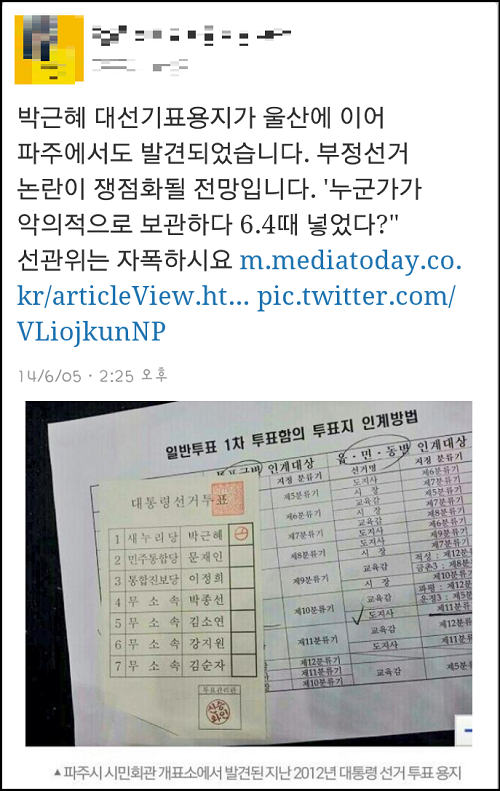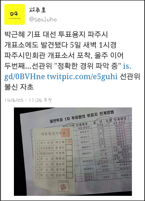 파주시 개표 참관인이었던 김철기(39)씨는 <미디어오늘>에 “4일 밤 새벽 1시경 파주시 시민회관 개표소에서 투표함을 여는데 그 자리에서 투표용지 한 장이 2012년 대선 투표용지로 박근혜 후보가 찍혀 있는 것을 발견해 사진을 찍고 페이스북에 올렸다”고 말했다.