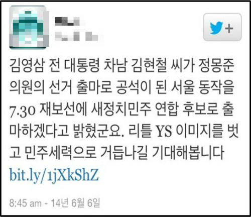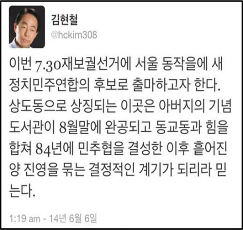 YS의 차남 김현철 한양대 행정학대학원 교수가 정몽준 전 새누리당 의원의 지역구인 서울 동작을 재보궐 선거 출마를 선언해 눈길을 끌고 있다.