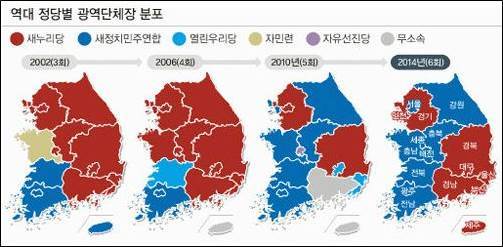 게다가 충청권의 심장인 대전의 경우 야당이 압승을 거둔 서울에 필적할 만한 결과를 냈다. 5개 구청장중 새누리당은 단 1명이었고, 나머지 4명은 야당 소속이다. 총 22석인 시의회도 16석을 새정치민주연합이 차지해 과반을 훌쩍 넘겼다.