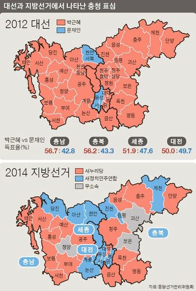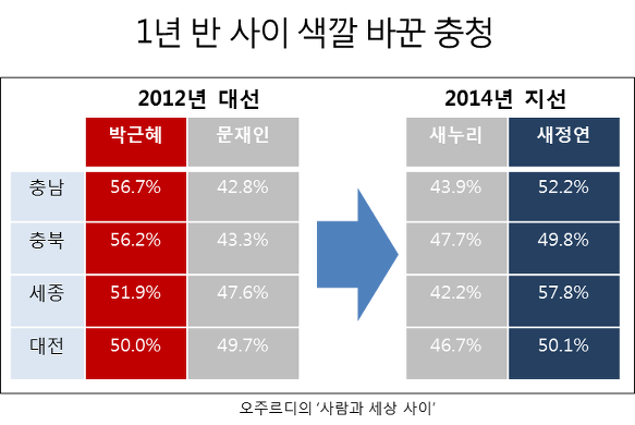 그러던 충청권이 이번 6.4지방선거에서 새누리당 깃발을 내던졌다. 대신 광역 네 곳 모두에 새정치민주연합 깃발을 꽂았다. 충청권 전체가 ‘야당 컬러‘ 일색이 된 건 1995년 지방자치가 시작된 이후 처음이다. 2012년 대선 때 입었던 붉은 옷을 1년 반 만에 벗고, 새정치민주연합의 파란색으로 갈아입은 것이다.
