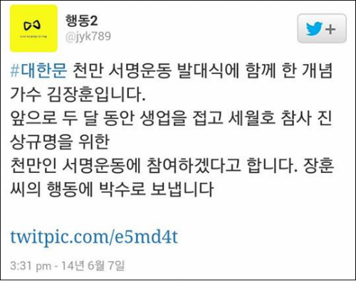 세월호 참사 희생자 유가족들이 특별법 제정을 위한 천만명 서명운동에 나선 가운데, 가수 김장훈 씨가정부에 철저한 진상규명을 촉구하며 동참했다.