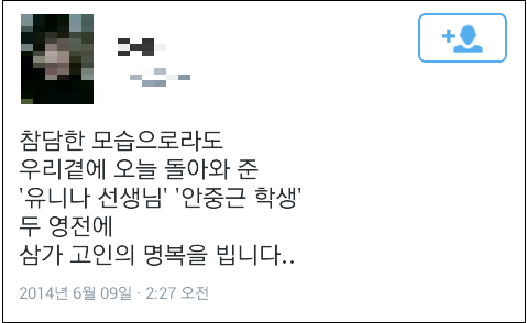 세월호 사고 54일 만에 발견된 남성 시신의 신원이 단원고 2학년 7반 안중근 학생인 것으로 밝혀지자, 트위터에 쏟아진 네티즌들의 댓글이다. 네티즌들은 54일 만에 부모님 품으로 돌아온 안군을 위로하며 애도를 표했다.
