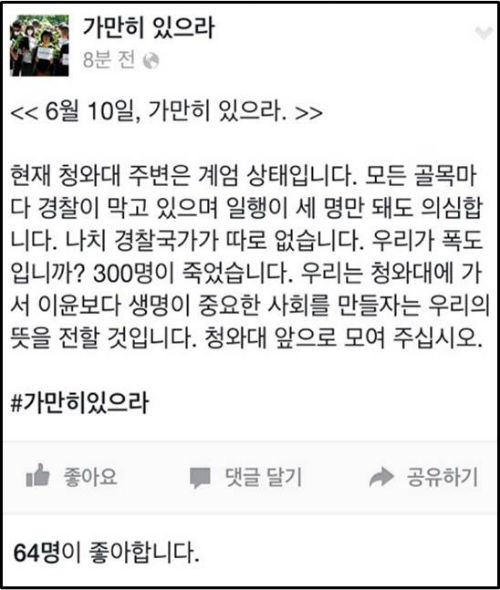경희대, 고려대 등 ‘가만히 있으라’ 침묵행진 참가자들도 오후 4시 홍대 침묵행진에 이어 청와대 행진을 예정대로 진행할 것이라고 공지했다.