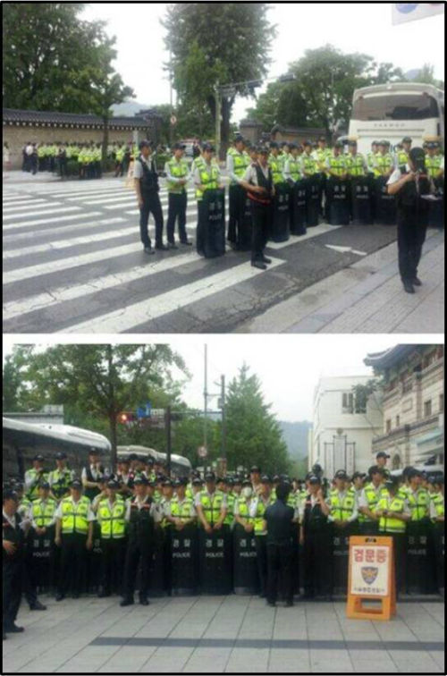 이 밖에도 시민들은 SNS를 통해 경찰이 시민들의 통행을 막아서는 사진과 함께 “만민공동회 장소 봉쇄 중”(ahnj****), “국립현대미술관 서울관 가는길 초입부터 경찰이 막고 있네요”, “(soon******), ”경찰이 불법으로 길을 막아 외국인들 구경하며 지나간다“(phd***), ”삼청동 입구 경복궁 옆 ‘검문중’ 팻말과 함께 경찰들 깔렸습니다“(arco*****) 등의 상황을 전하고 있다.
