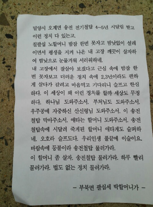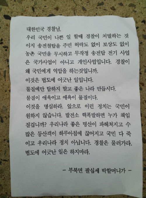 이날 SNS에는 두 장의 편지가 찍힌 사진이 실시간으로 번지는 등 네티즌들의 눈길을 끌었다. ‘부북면 팝실세 박 할머니’라고 밝힌 이 편지에는 “송전탑 전기 사업은 국가사업이 아니고 개인사업입니다. 경찰이 왜 국민에게 억압을 하는 것입니까”라며 “이것은 법도에 어긋난 일입니다. 물질에만 탐하지 말고 좋은 나라 만듭시다. 물질이 애욕이고 애욕이 물질이다”라고 적혀있다.