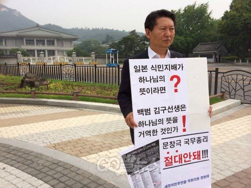 17일 정청래 새정치민주연합 의원이 청와대 앞에서 “문창극 국무총리 후보자 절대 안돼”라는 피켓을 들고 문 후보자 지명 철회 및 사퇴 촉구 1인 시위를 벌이고 있다.