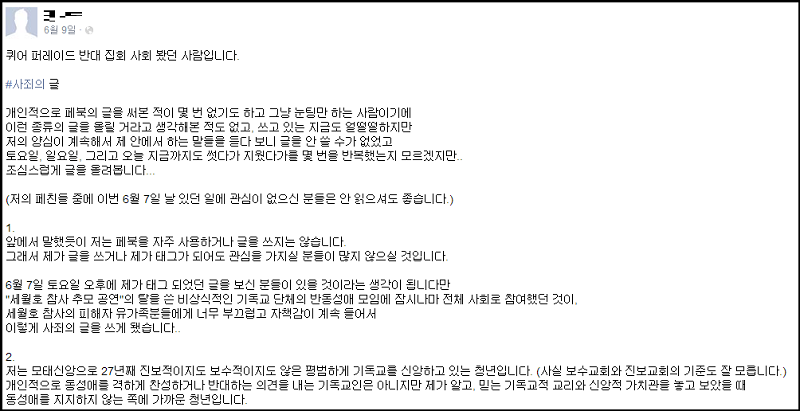 지난 7일 신촌 연세로에서 개최된 '퀴어문화축제'에 반대하기 위해 '세월호 추모 콘서트'라는 이름으로 개최된 행사에 사회를 봤다고 주장하는 청년이 자신의 페이스북에 '양심선언'에 가까운 사과문을 게시했다.