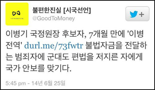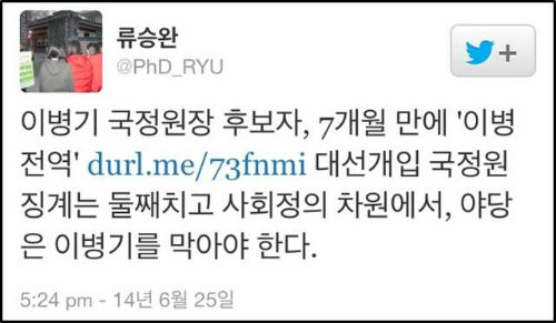 한 네티즌(시나**)은 “어찌 국정원장을 보충역보다 복무기간이 짧은 이를 지명하나?”라고 꼬집었고, 또 다른 네티즌(이**)은 “참으로 한심한 인사. 차떼기 배달부에 6개월 방위가 국정원장? 이런 이가 대한민국 최고의 정보기관 수장이 가당키나 한가?”라고 비난했다.