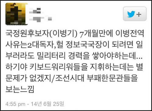 해당 소식을 접한 네티즌들은 비난 목소리를 높였다. 군 복무도 제대로 마치지 않은 이가 어떻게 최고 정보기관장을 맡겠냐는 것이다.