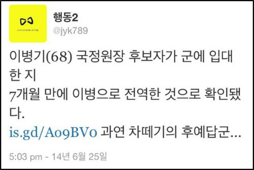 24일 국회에 제출된 이 후보자의 인사청문회 요청안에 따르면, 이 후보자는 지난 1975년 5월 7일 육군에 입대해 같은 해 12월 4일 이병으로 전역했다. 전역사유는 ‘가사사정’.