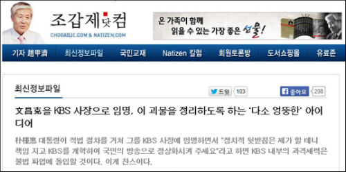 조갑제 전 <월간조선> 대표가 박근혜 대통령에게 문창극 전 총리 후보가 ‘KBS를 개혁해 국민의 방송으로 돌려놓을 적임자’라며 사장에 임명하라고 촉구했다.