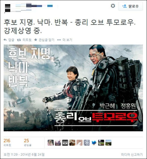 <엣지 오브 투모로우> 역시 전투 중 죽으면 처음으로 다시 돌아간다는 독특한 설정을 가진 영화로, 사의를 표명했음에도 다시 총리 역할을 수행해야 하는 정 총리의 상황과 비슷하다.