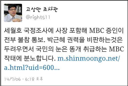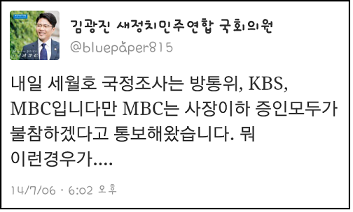 6일 새정치민주연합 김광진 의원은 트위터를 통해 “내일 세월호 국정조사는 방통위, KBS, MBC입니다만 MBC는 사장 이하 증인 모두가 불참하겠다고 통보해왔다”며 이 같은 소식을 전했다.
