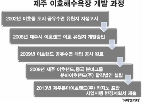 2002년 제주시는 공유수면 매립 고시를 시작으로 2011년말까지 총사업비 4200억원을 투자해 제주시 이호1동 일대 16만7824㎡의 육상부와 8만7889㎡의 공유수면 매립지 등 총25만5713㎡의 부지 안에 휴양콘도미니엄의 숙박시절과 마리나 시절, 국제센터, 농축산물센터,조각 공원 등의 대규모 이호유원지를 만드는 이호랜드의 개발을 승인해줍니다.