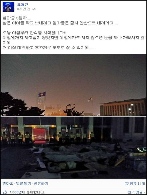 유경근 가족대책위원회 대변인은 자신의 페이스북에 이같은 내용을 전하며 “이렇게 까지 하고 싶지 않았지만 이렇게라도 하지 않으면 눈썹 하나 까딱하지 않기에… 더 이상 미안하고 부끄러운 부모로 살 수 없기에”라고 밝혔다.
