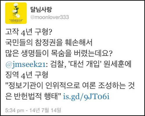 한 네티즌(바위***)은 “민주주의와 법치를 파괴하려한 자에게 4년은 너무 약하다. 우리나라 법은 힘 있는 자들에게 너무 관대하다”고 꼬집었고, 또 다른 네티즌(사*)은 “국정원이 정치에 개입해서는 절대 안 된다는 것을 보여줘야 할 것이다. 정치를 혼란스럽게 국민들의 판단을 흐리게 하는 정보원이야 말로 추방해야한다”고 주장했다.