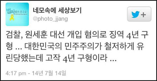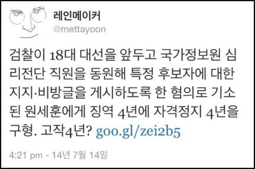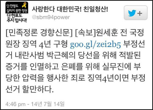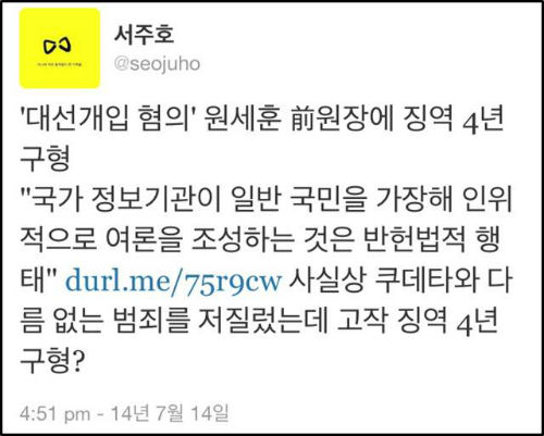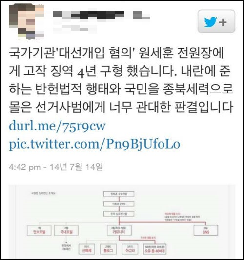 14일 서울중앙지법 형사합의21부(이범균 부장판사) 심리로 열린 결심공판에서 검찰은 “국가 정보기관이 일반 국민을 가장해 인위적으로 여론을 조성하는 것은 반헌법적 행태”라며 “이 사건을 국정원장이 국정원의 역할에 대한 그릇된 인식을 갖고 자원을 사유화해 안보 역량의 저해를 초래한 심각한 범행이기에 준엄한 사법처리가 불가피하다”고 이같이 구형했다.