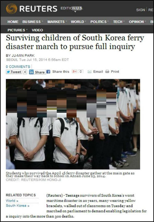외신 전문 번역 사이트 <뉴스프로>에 따르면, <로이터>는 15일 “한국 여객선 참사 생존 아이들, 전면 조사 추진을 위해 행진”이라는 제하의 기사를 통해 생존 학생들이 노란 팔찌를 차고 진상조사를 위한 법 제정을 촉구하는 행진에 나섰다고 전했다.