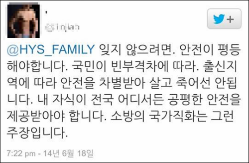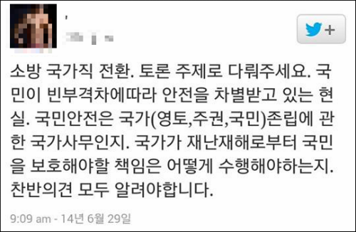 해당 글은 김택 중원대 경찰행정학과 교수가 이날 <경향신문>에 기고한 글로, 열악한 한국의 소방관들의 상황을 설명하고 소방직의 국가직화와 재난 구조 장비 현대화 강화를 촉구하는 내용이다.