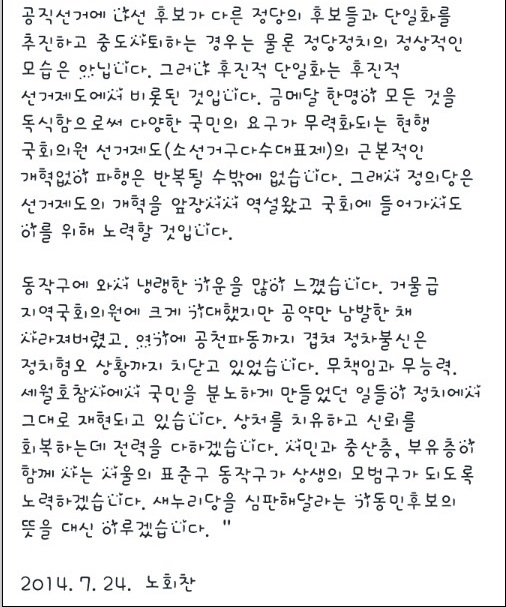 7.30재보궐선거 ‘서울 동작을’에 출마한 새정치민주연합 기동민 후보가 24일 전격 사퇴함에 따라 정의당 노회찬 후보로 야권이 단일화됐다. 기 후보의 사퇴에 노회찬 후보는 “새누리당을 심판해달라는 기동민 후보의 뜻을 대신 이루겠다”는 각오로 기 후보의 뜻을 받아들였다.