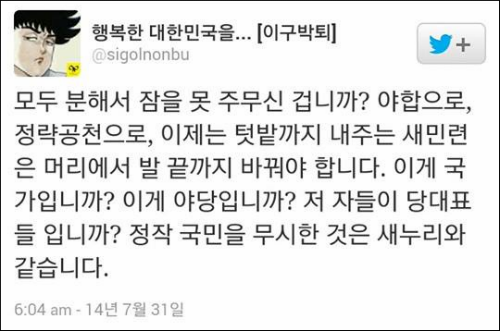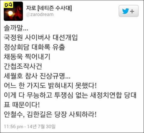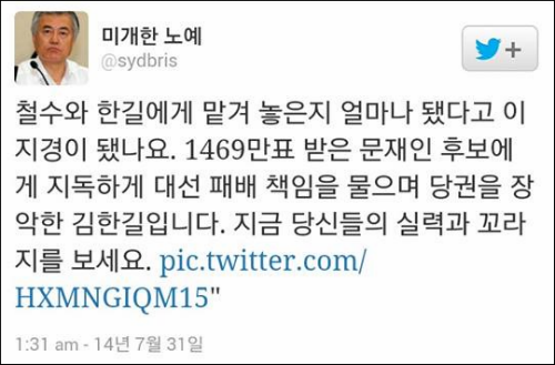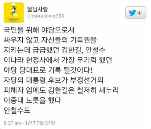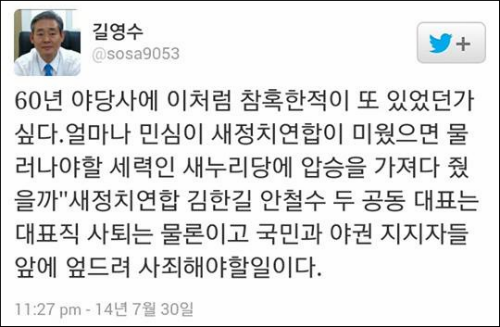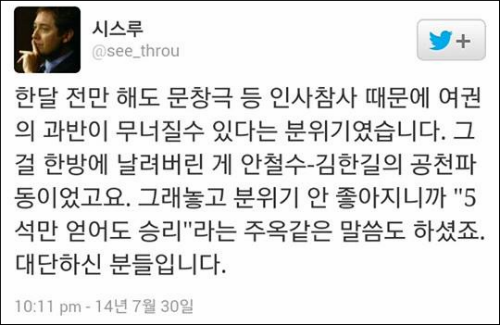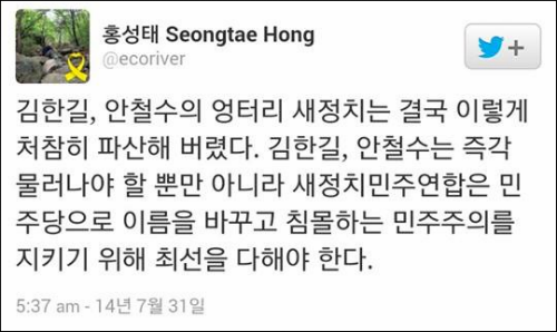 개표가 진행되면서 야당의 패배가 확실해지자 네티즌들은 “세월호 피해자들에게 부끄러운줄도 모르는 안철수 김한길”(@strong****), “4.16일 이 정부의 무능을 보고도 계속 이런 결과라니. 한길이 철수 새누리 2중대 성공했네”(@sheon****), “선거결과가 안철수, 김한길에게 주는 메시지다”(@ksyo*****), “초반 개표중 새누리 11 새정연 4 김한길, 안철수 이번 재보선 공천에 책임지고 당대표 사퇴하라”(@moonl*******)라며 두 공동대표를 비판했다.