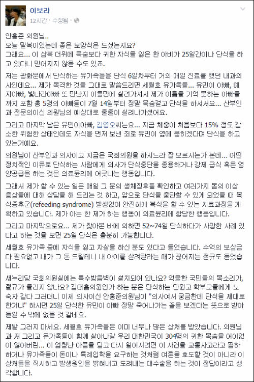 단식하는 유가족들을 거의 매일 진료했던 내과의사라고 자신을 소개한 이보라 씨는 7일 저녁 페이스북에 “25일 단식한 유민이 아빠 정말 죽어나가는 꼴 보겠다는 뜻으로 받아들일 수밖에 없을 것 같다”며 “제발 그러지 마세요. 세월호 유가족들은 이미 너무나 많은 상처를 받았습니다”라고 비난했다.