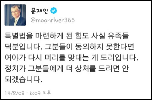 문재인 의원은 8일 자신의 트위터에 “여야 합의보다 더 중요한 건 유족들의 동의”라면서 “그분들이 동의하지 못한다면 여야가 다시 머리를 맞대는 게 도리”라고 밝혔다.