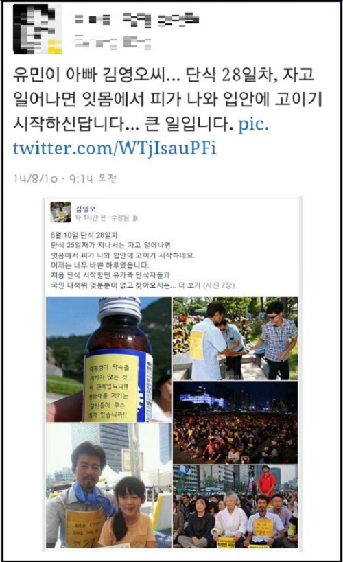 ‘세월호 특별법’ 제정을 촉구하며 의료진의 진료까지 거부한 채 28일째 단식을 이어가고 있는 ‘유민아빠’ 김영오 씨에 대한 우려의 목소리가 SNS상에 잇따르고 있다.