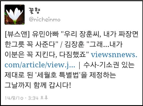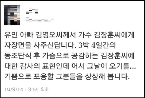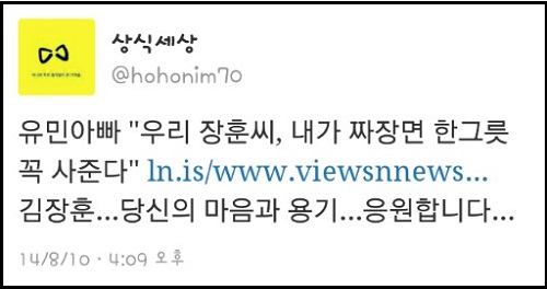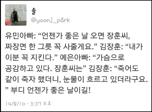 이어 “그러면서 ‘정말 고맙고.. 언젠가 좋은날 오면 우리 장훈씨 내가 짜장면 한 그릇 꼭 사준다’고.. 다른 것도 아니고 짜장면(이) 유민아빠는 그게 젤 먹구싶나봐요”라며 안타까움 마음을 표현했다.