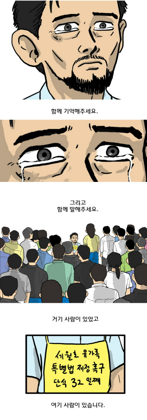 이어 “그리고 함께 말해 주세요. 거기 사람이 있었고 여기 사람이 있습니다”며 특별법 제정을 촉구하며 단식 중인 김 씨에게 관심을 가져달라고 촉구한다.
