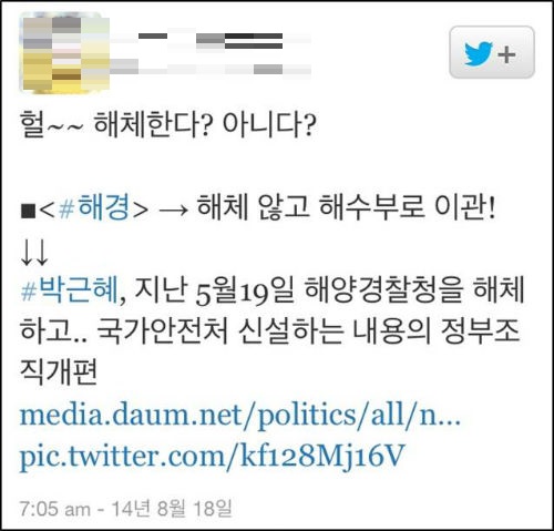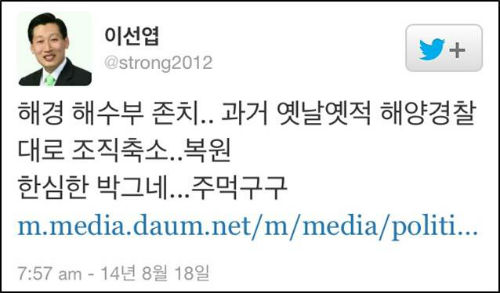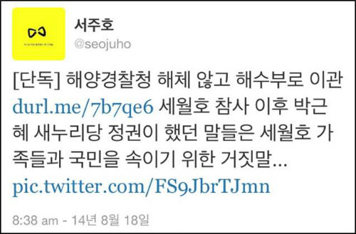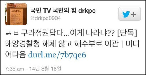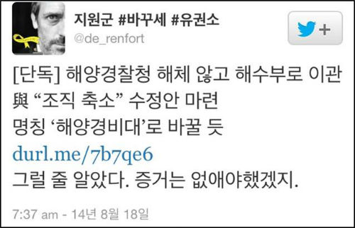 18일 <세계일보>는 “여권은 세월호 참사 수습과정에서 제대로 대처하지 못한 해양경찰청을 해체하기로 한 당초 방침을 바꿔 해양수산부 소속으로 이관해 사실상 존치하는 쪽으로 가닥을 잡았다”면서 “해경의 기구를 대폭 축소하고 기능을 불법어로 단속과 해양 구조·구난, 경비에 한정하며 명칭도 변경하기로 했다”고 보도했다.