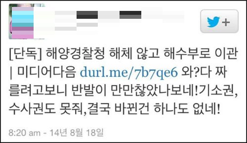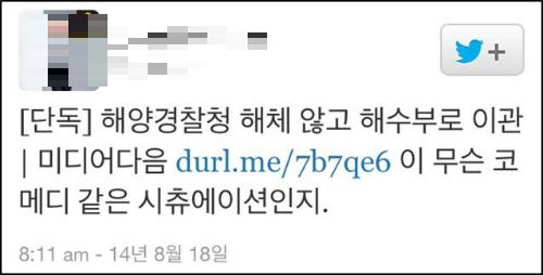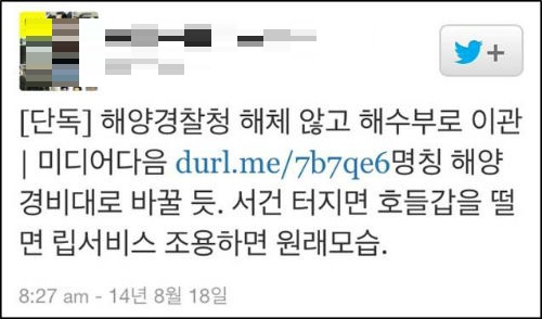 국가안전처로 흡수돼 해체될 것으로 알려진 해양경찰청이 당초 ‘해체’가 아닌 조직 대폭 축소로 해양수산부로 이관될 전망이라는 보도가 나와 네티즌들의 비난이 들끓고 있다.