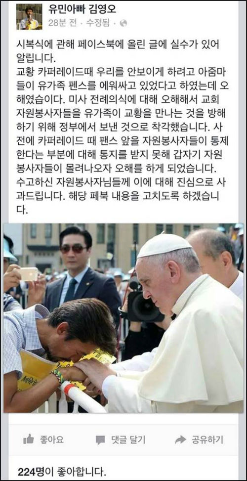 앞서 김씨는 페이스북을 통해 “16일 시복 미사 직전 유가족과 같은 흰색옷을 입고 도우미라며 유가족 펜스를 에워싸고 있었다. 교황 성하께서 카퍼레이드 할 때 우리를 안보이게 하려고”라는 글을 게시해 논란이 인 바 있다.