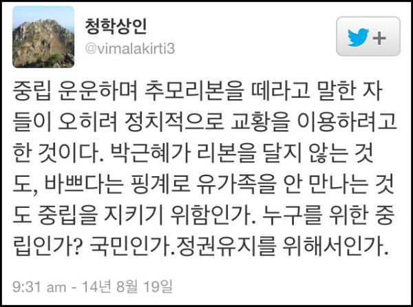 이에 네티즌들은 “교황님께 중립 운운하는 질문 자체를 이해 못하겠다. 세월호 사건에서 무엇이 정치와 연관되어 있는지. 인간의 본능인 측은지심이 한국사회에서 정치적이라 명명되는지.‘인간은 못 되도 괴물은 되지 말자!’라는 말이 떠오른다”(@jen****), “추모하는 것이 중립을 깨는 것? 작은 리본 하나 달았다고 정치적 중립 어쩌고 하는 것들은 인간인가, 짐승인가!”(@Woo****), “인간적인 고통에마저 정치적 꼬리표를 붙이는 그들이 이제는 안쓰럽고 딱할 지경”(@jim****)등의 반응들을 보였다.