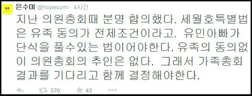 은수미 의원도 “유족 동의 없이 의총의 추인은 없다”며 유가족들의 동의를 중시했다.