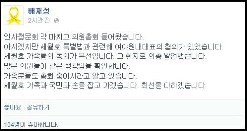 새정치연합의 대다수 의원들은 합의된 내용에 부정적인 의견을 보이며 “유가족의 의견을 존중해야 한다”는 뜻을 표했다.
