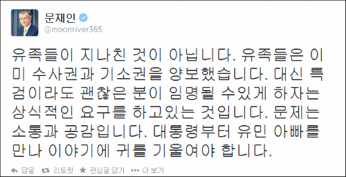 서울 광화문 단식농성장에서 유민아빠 김영오 씨와 이틀째 단식 농성 중인 문재인 새정치민주연합 의원이 유족들의 대통령 면담 요구와 관련해 SNS에 “대통령부터 유민 아빠를 만나 이야기에 귀를 기울여야 한다”고 쓴소리를 했다.